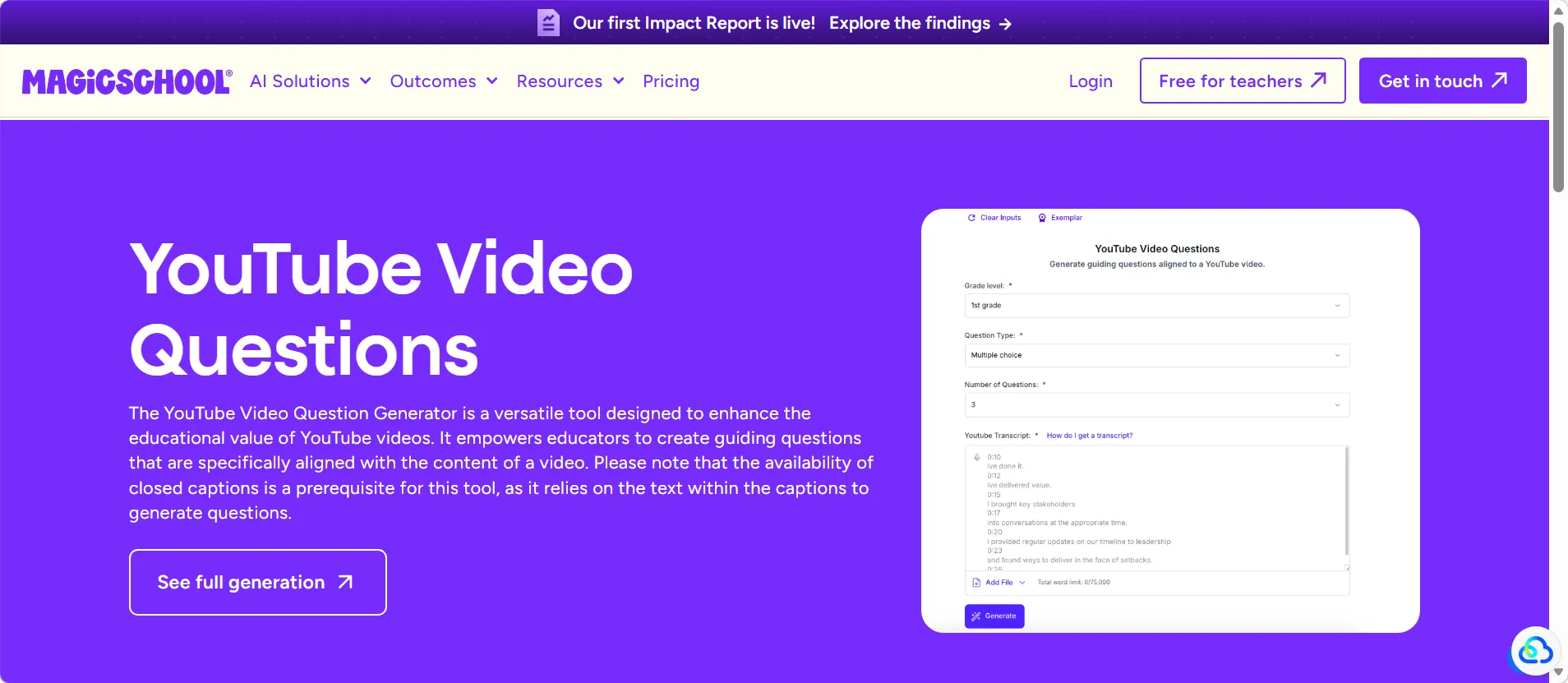 You can specify grade level, question count, and question format, which makes it a solid tool for differentiated instruction. Paste in a documentary clip, a science explainer, or a historical speech and have discussion questions or a short quiz ready before the video finishes playing.