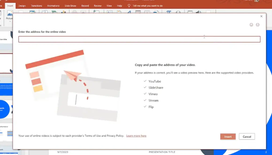 PowerPoint plays nice with several platforms: YouTube, Vimeo, SlideShare, Microsoft Stream, and Flip. If you’re using something else, you might need to download the video and embed it locally instead.