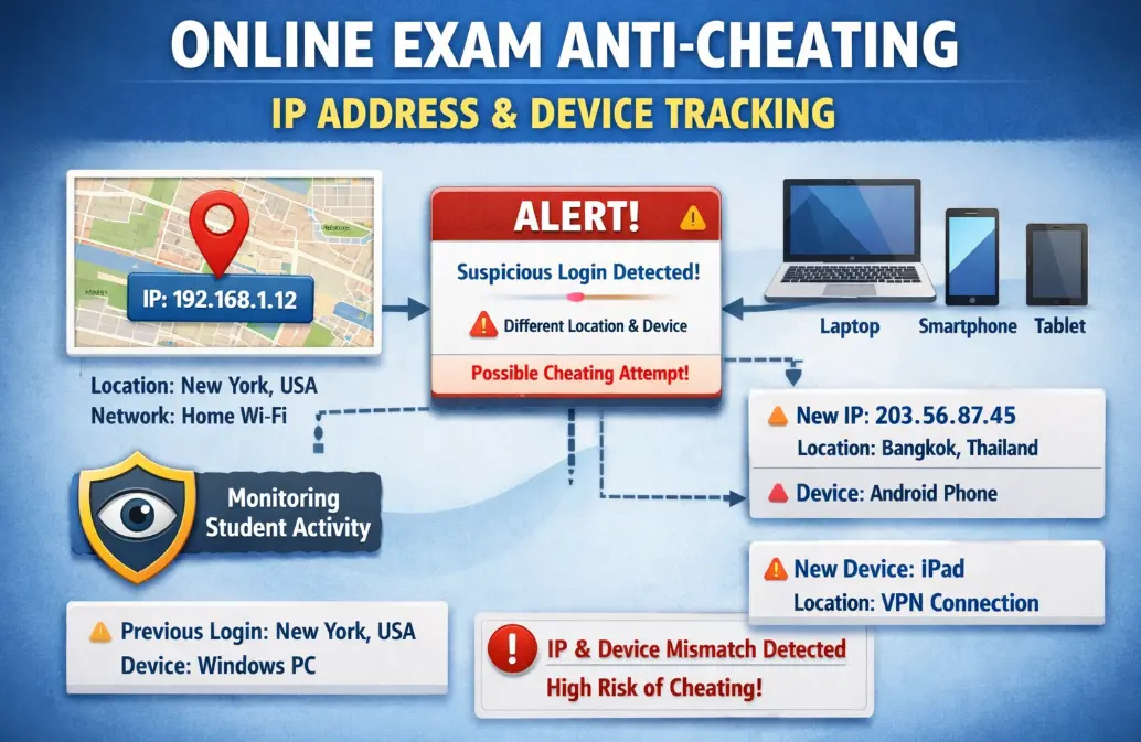 Every device connecting to the internet has a unique identifier—its IP address. Monitoring this reveals suspicious patterns. Is the same student logging in from three different locations simultaneously? Red flag. Did they suddenly switch from New York to California mid-exam? Worth investigating.