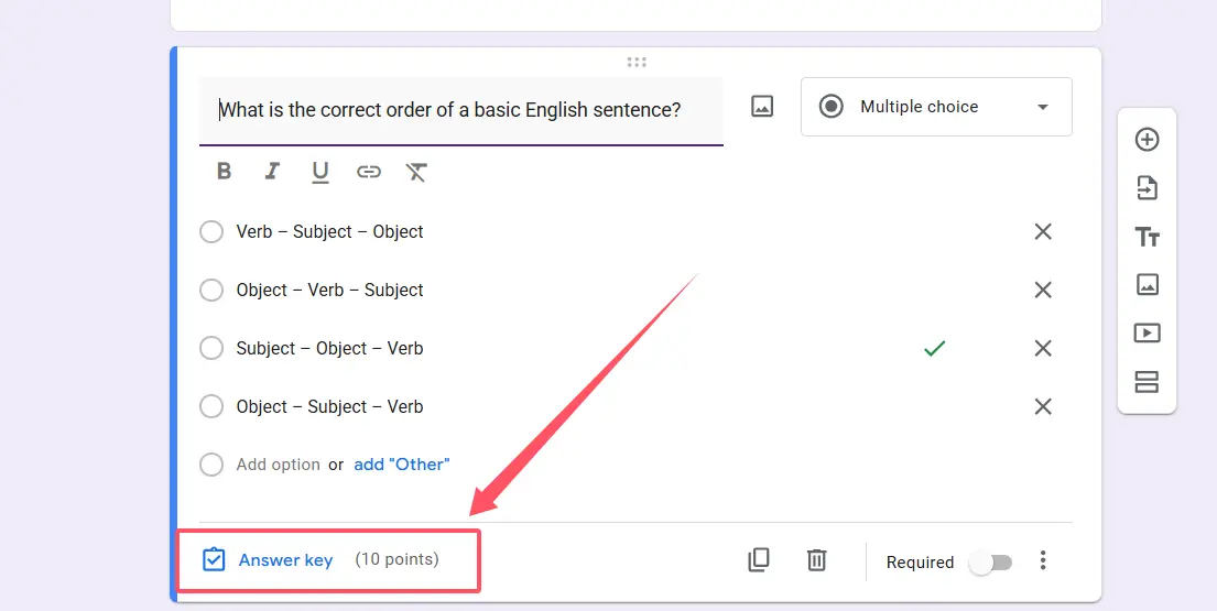 At the bottom of the question box, you’ll spot an “Answer key” button. Click it. This opens up the grading interface where you can set correct answers and adjust point values. Look for the “Points” field—it might show 0 or 1 by default, depending on how you initially set things up.