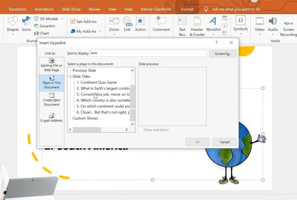 - Choose “Place in This Document” and select your first question slide