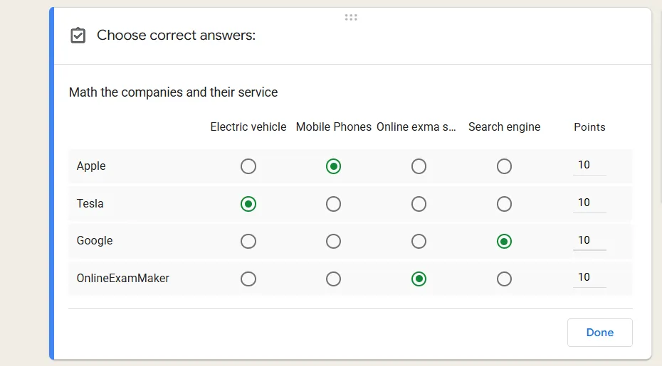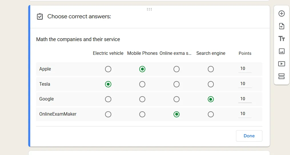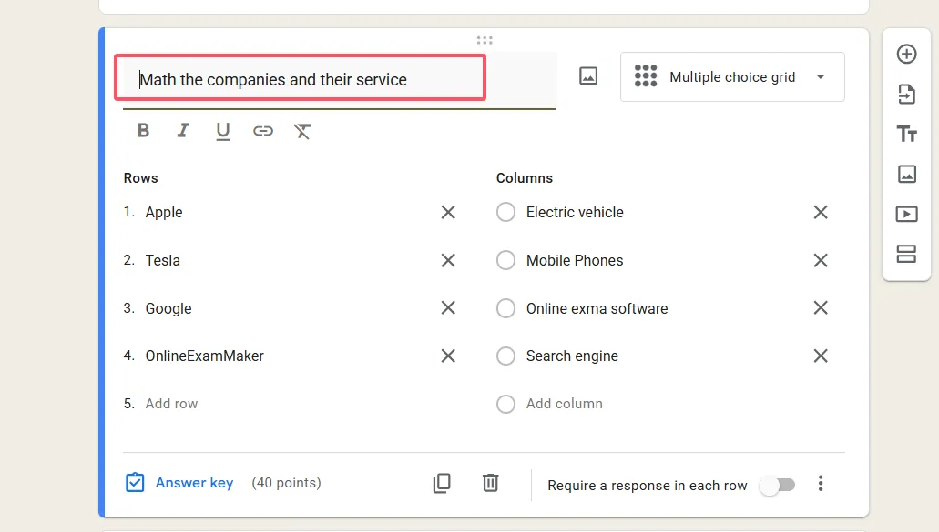 Back in your matching question, you’ll now see an “Answer key” option at the bottom. Click it and select the correct column match for each row. Assign point values—you can give one point per row or weight them differently based on difficulty. Want to reward students for nailing the tricky ones? Give those rows more points.