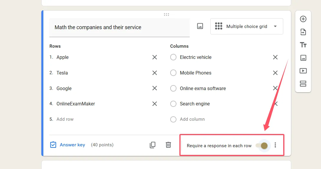 Toggle on “Require a response in each row” to ensure students don’t skip any matches. This forces completion and gives you cleaner data to analyze.