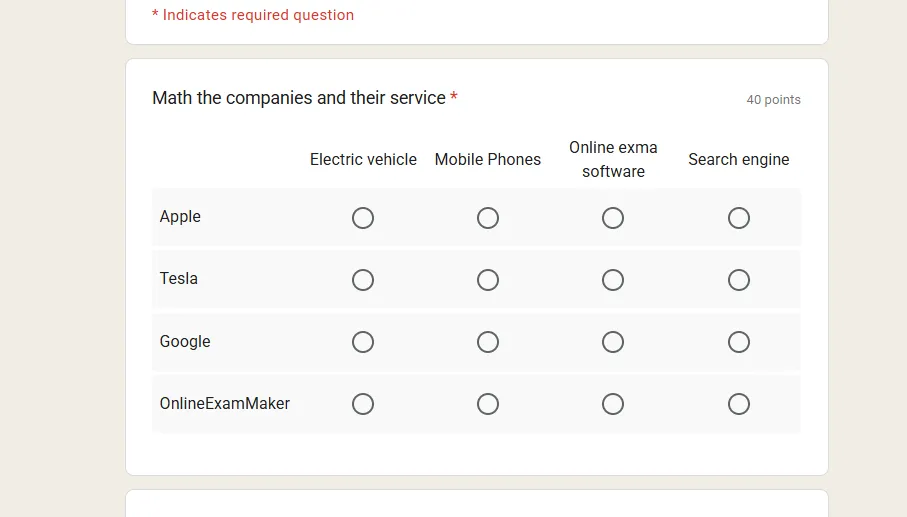 The secret weapon? The Multiple Choice Grid. This question format lets you pair items from rows with columns, creating that classic matching experience where students connect terms with definitions, dates with events, or concepts with examples. It’s not perfect, but with the right setup, it mimics a true matching question remarkably well.