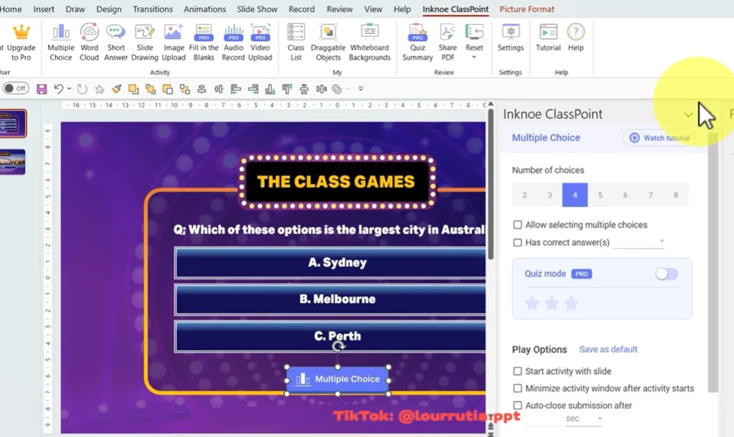 On any question slide, click the ClassPoint tab, then “Multiple Choice.” A button appears on your slide.