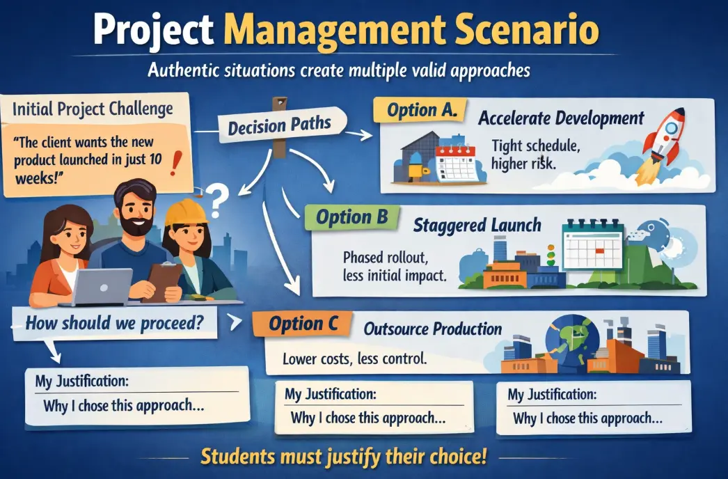 - Specific: “You’re managing the launch of a new employee wellness program with a $50,000 budget and a three-month timeline. Two weeks in, your key vendor drops out. Walk through your next steps using project management principles.”