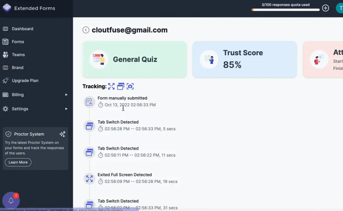 When students access the quiz, they’ll be prompted to enable their camera and accept full-screen mode. The system then monitors their activity and generates a trust score based on detected events.