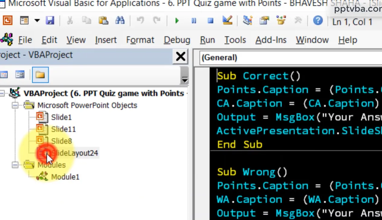 For each question slide, you’ll attach macros to answer buttons. When someone clicks the correct answer: