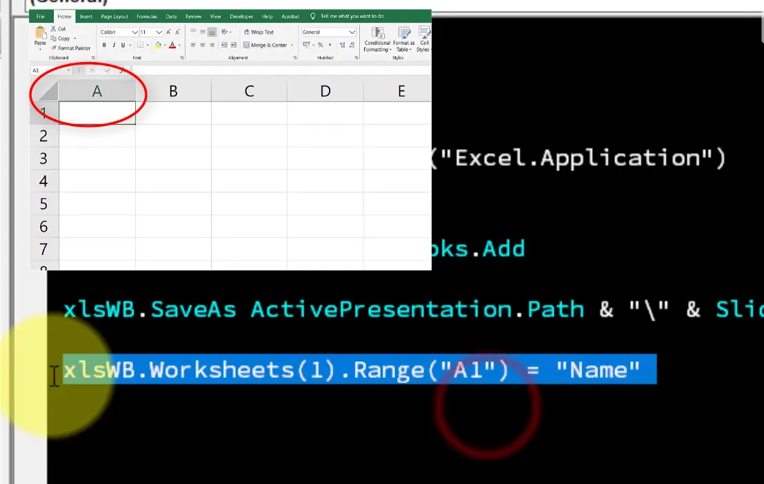 xlWS.Range("A1") = "Name"