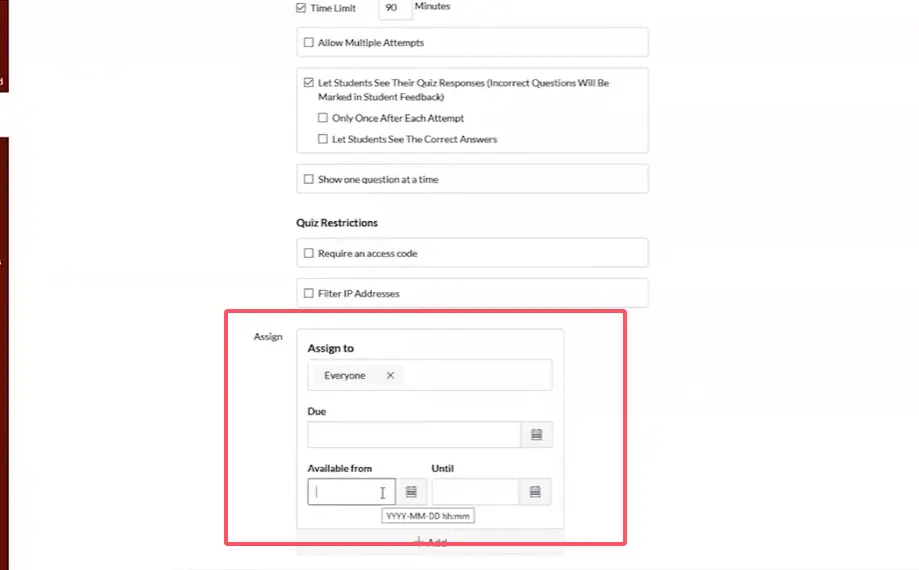 Click “+ Add” under the “Assign to” section. You can create separate assignment parameters for individual students or groups.