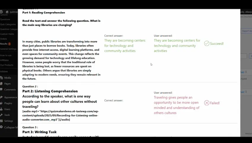 Think of Quiz Maker as your Swiss Army knife for language assessments. It’s a WordPress plugin that lets you create everything from simple vocabulary quizzes to complex, multi-skill language tests. The beauty? You don’t need to be a tech wizard to use it.