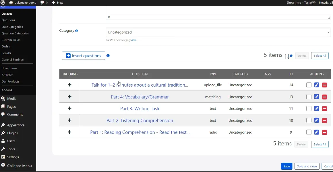 Here’s the moment of truth. Click “Insert Questions” and you’ll see all the questions you’ve created. Select the ones you want – reading comprehension, listening exercises, writing prompts, speaking tasks – and add them to your quiz.