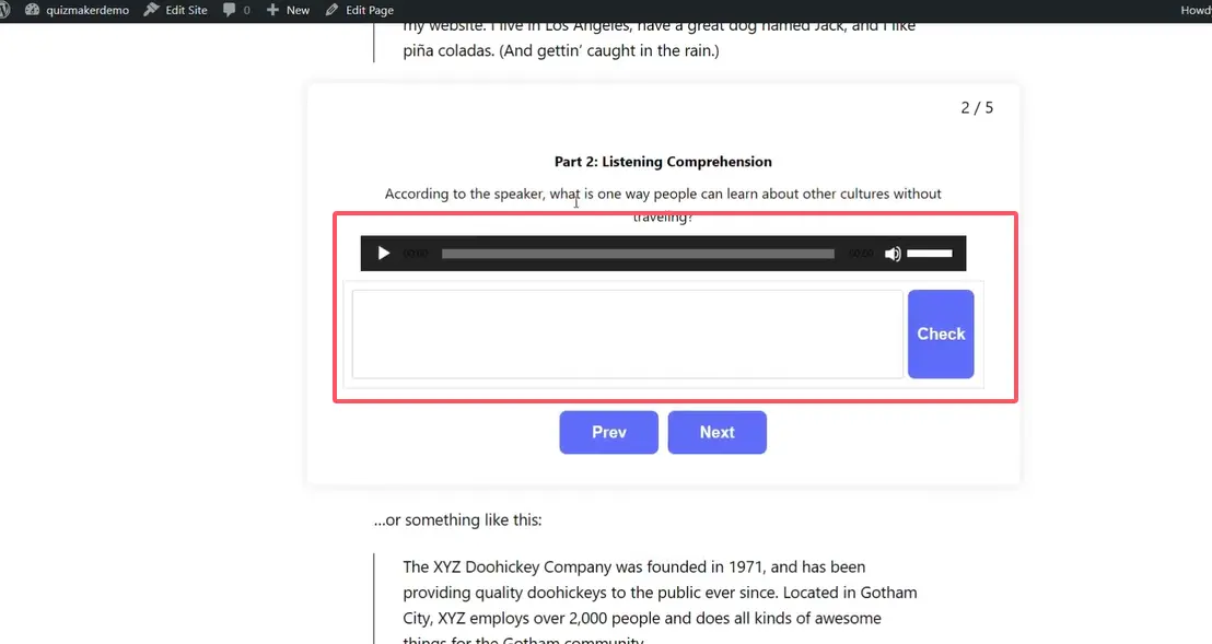 Next up? A listening exercise. The audio player appears right on the page – no external links, no complications. Students listen, digest the content, and type their responses.
