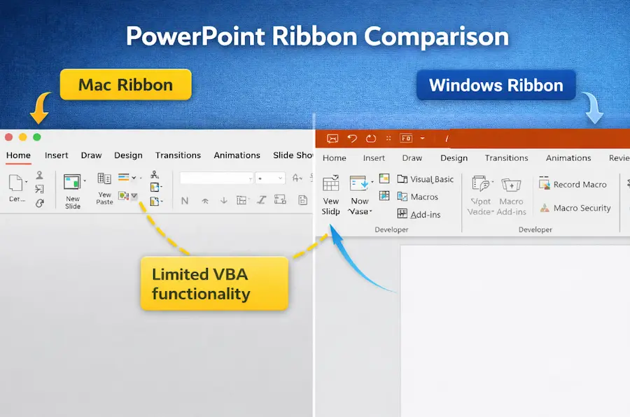 Let’s address the elephant in the room first. Yes, PowerPoint for Mac technically supports VBA. But it’s like saying a bicycle technically supports highway travel—sure, it might get you there, but you’re going to have a rough time.