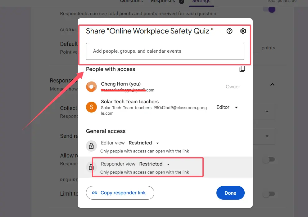 The most straightforward restriction is limiting your quiz to people with specific Google accounts. Here’s how it works:
