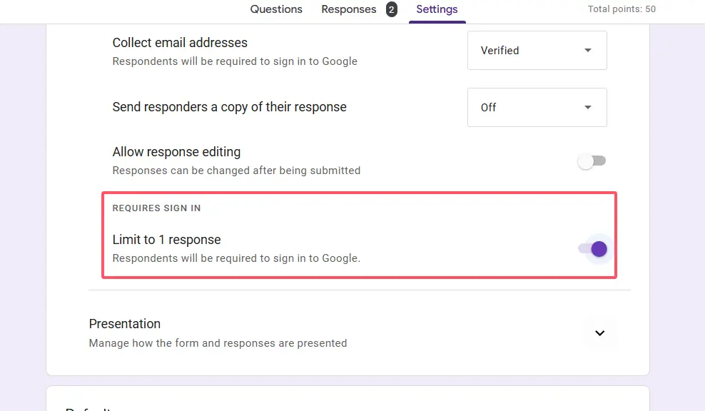 Here’s a sneaky feature that does double duty. Turn on Limit to 1 response in your settings. This forces respondents to sign in with their Google account and prevents the same person from submitting multiple times.