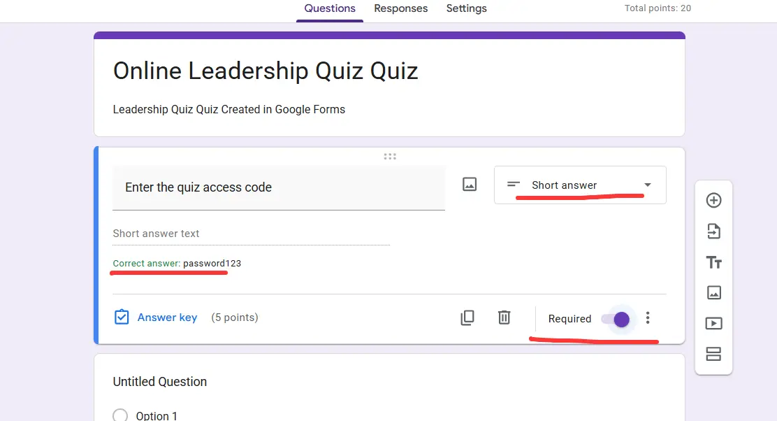 - Create a new short-answer question at the top of your form. Something like “Enter the quiz access code” or “What’s the password for today’s quiz?”