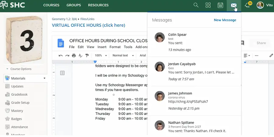 I tell my students on Day One: “Don’t email me. Use the Schoology messenger.” It keeps everything organized, searchable, and tied directly to the course. When a student asks about an assignment, I can see their work right there in the same platform. It’s like having your classroom, gradebook, and office hours all in one spot.