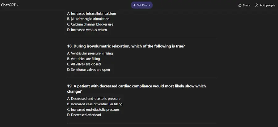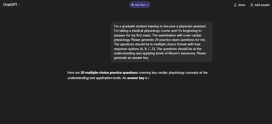 “I’m a graduate student training to become a physician assistant. I’m taking a medical physiology course and I’m beginning to prepare for my first exam. The examination will cover cardiac physiology. Please generate 20 practice exam questions for me. The questions should be in multiple choice format with four response options (A, B, C, D). The questions should be at the understanding and applying levels of Bloom’s taxonomy. Please generate an answer key.”