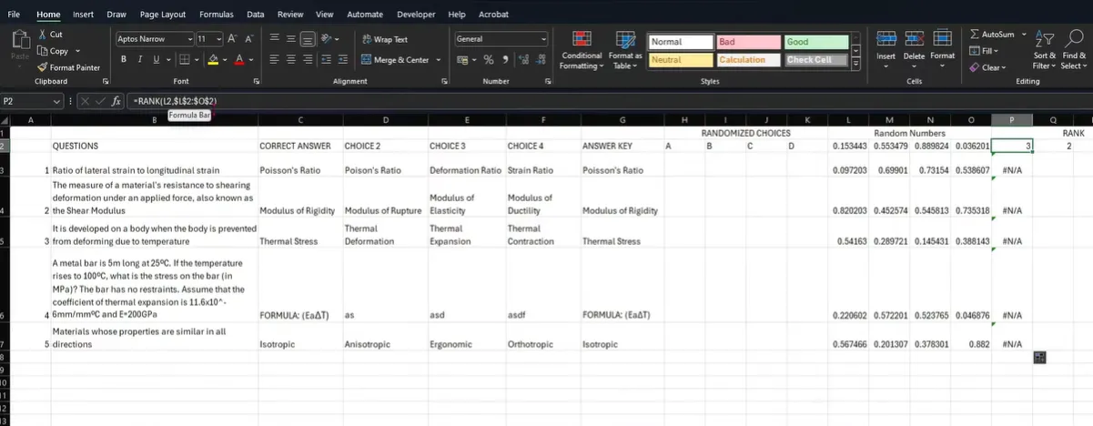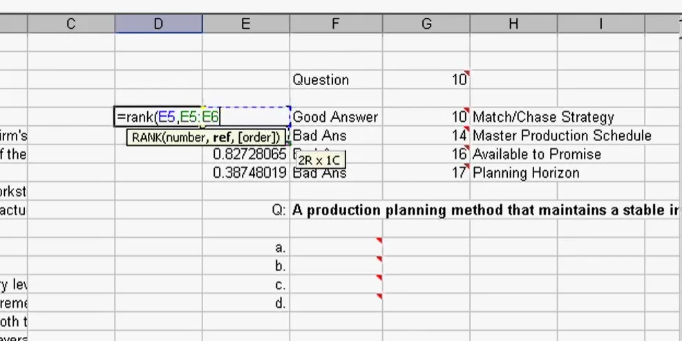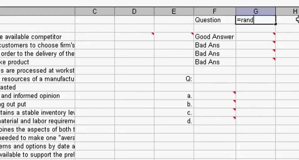 Where L2 contains your rank for answer position A. The beauty of this setup is that every time you recalculate (press F9), you get a completely different arrangement of answer choices while maintaining which answer is actually correct.