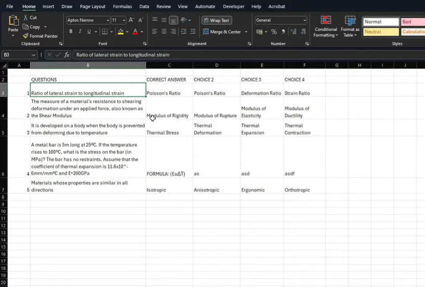 The CHAR(10) function inserts line breaks. Enable “Wrap Text” in Excel to see it formatted, then copy to Word for final formatting. This creates properly formatted quiz questions ready for printing or digital distribution.