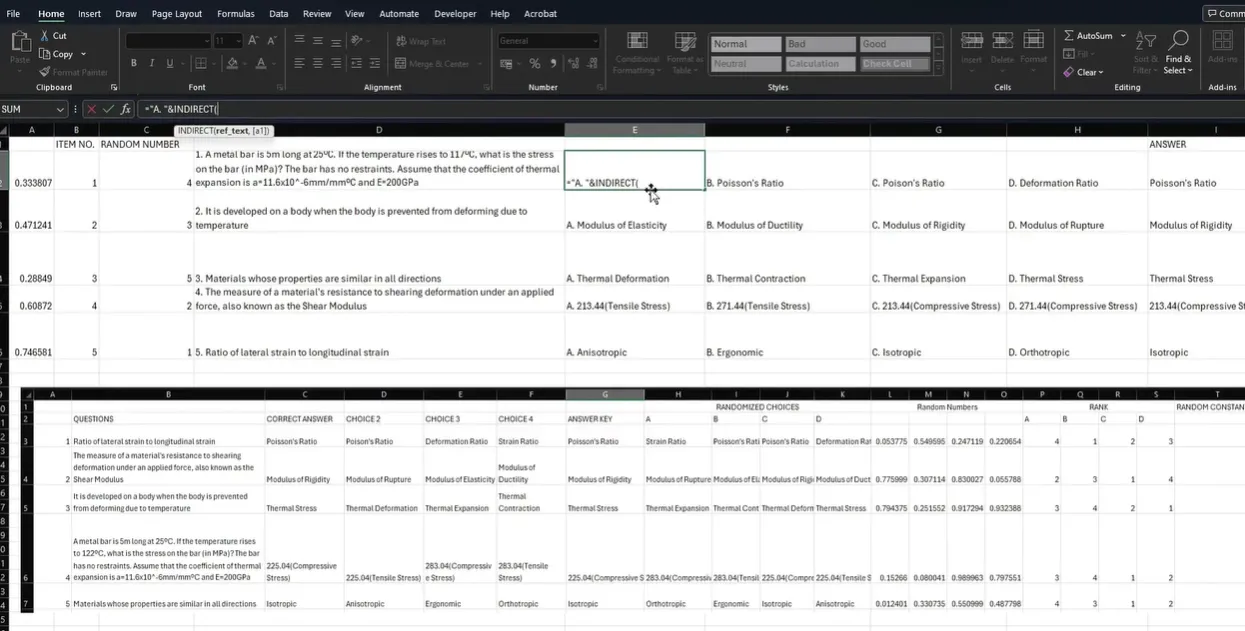 When you randomize both questions and answers, you need a way to map back to the correct answer. The INDIRECT function solves this by dynamically referencing cells based on your randomization: