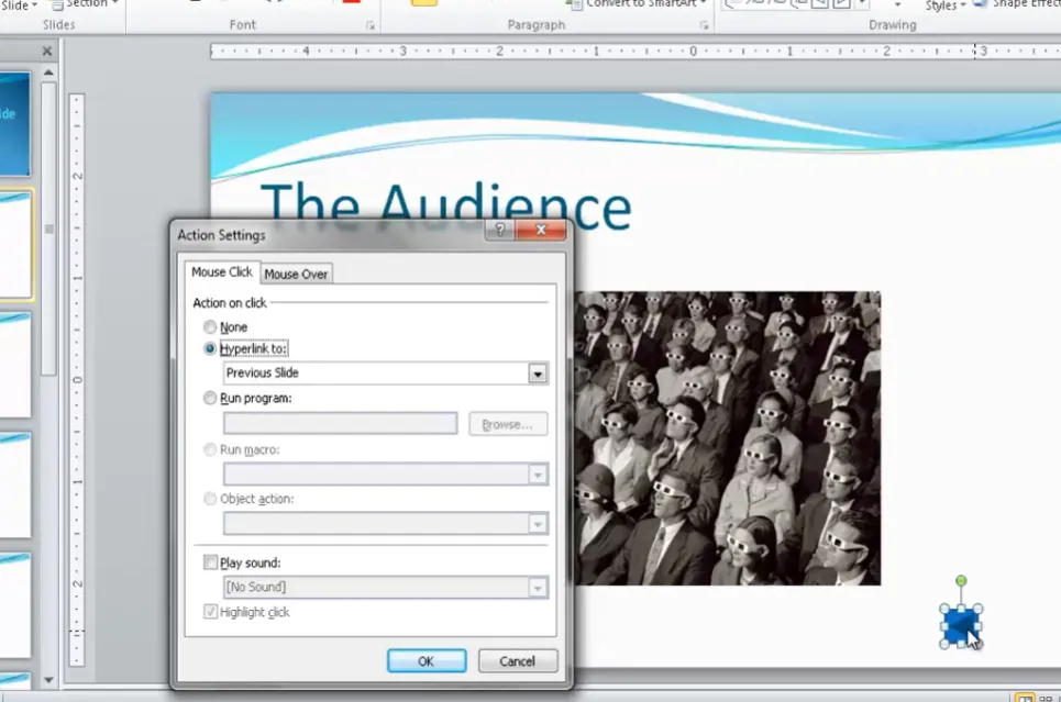 When you draw an action button on your slide, the Action Settings dialog automatically pops up. PowerPoint is smart enough to pre-select the logical hyperlink (forward arrow links to next slide, back arrow to previous slide, etc.).