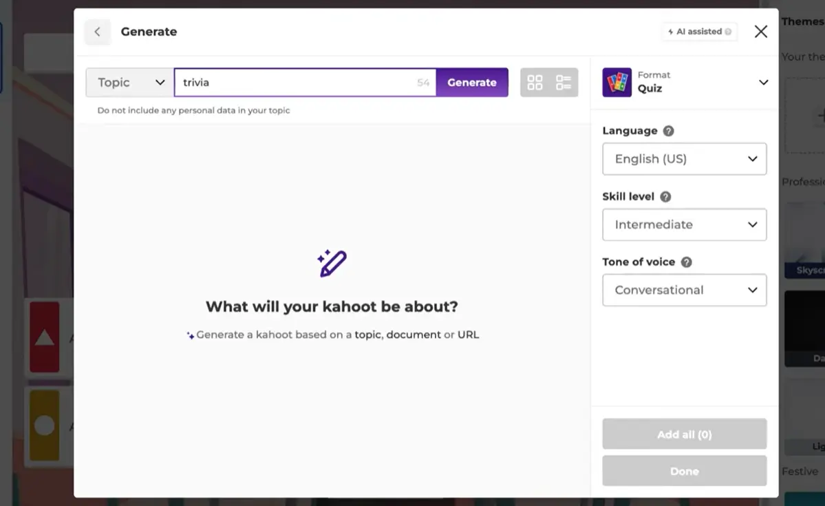 6. Review the suggested questions. Add individual ones you like, or hit “Add All” to bulk-import them. Click Done to insert them into your kahoot.
