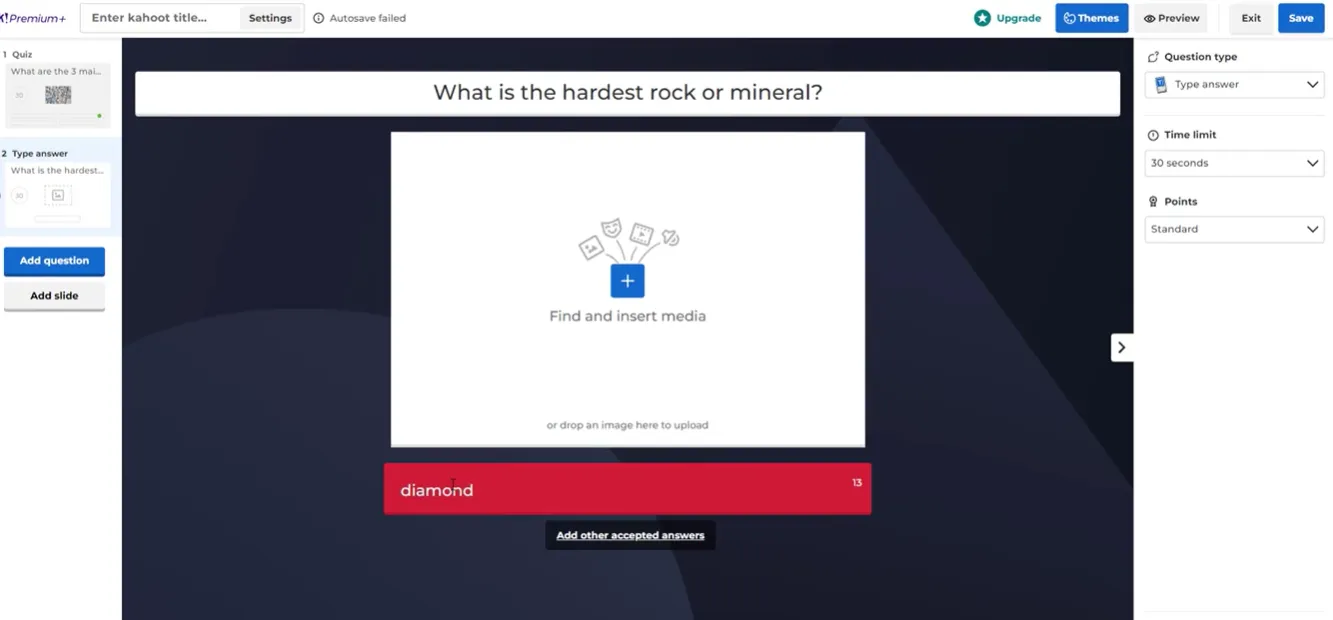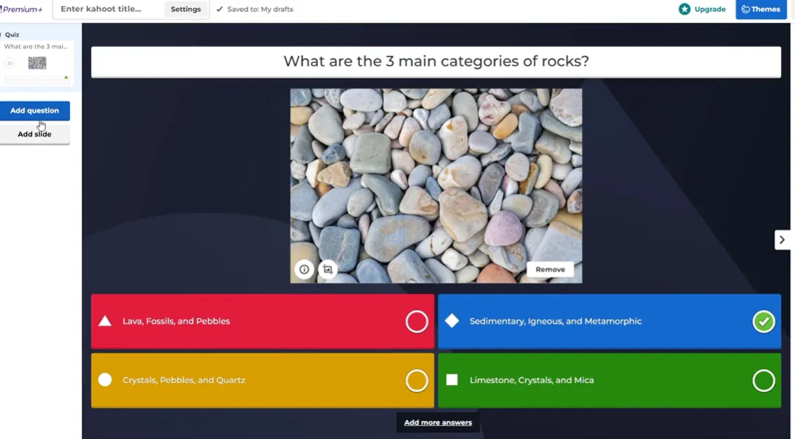 The classic. You write a question, give 2–4 answer options, mark one or more as correct, and watch the room light up. It’s fast, familiar, and works for almost any topic. If you’re new to Kahoot, this is where you start — and honestly, you could run an entire session with nothing else.