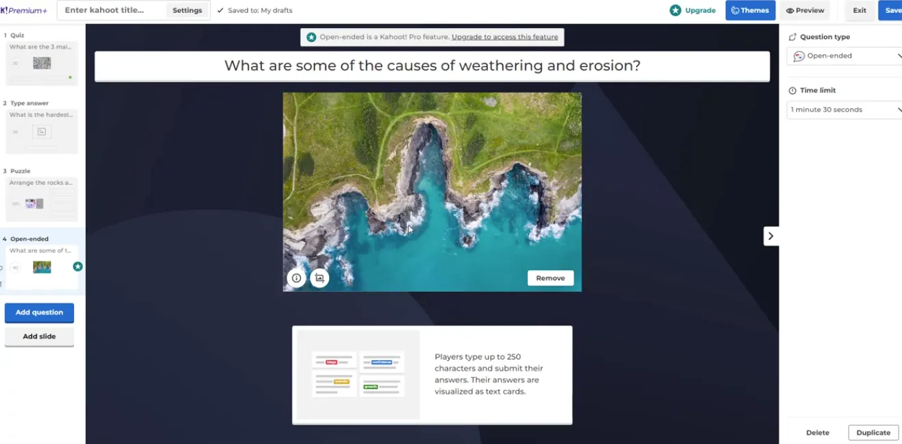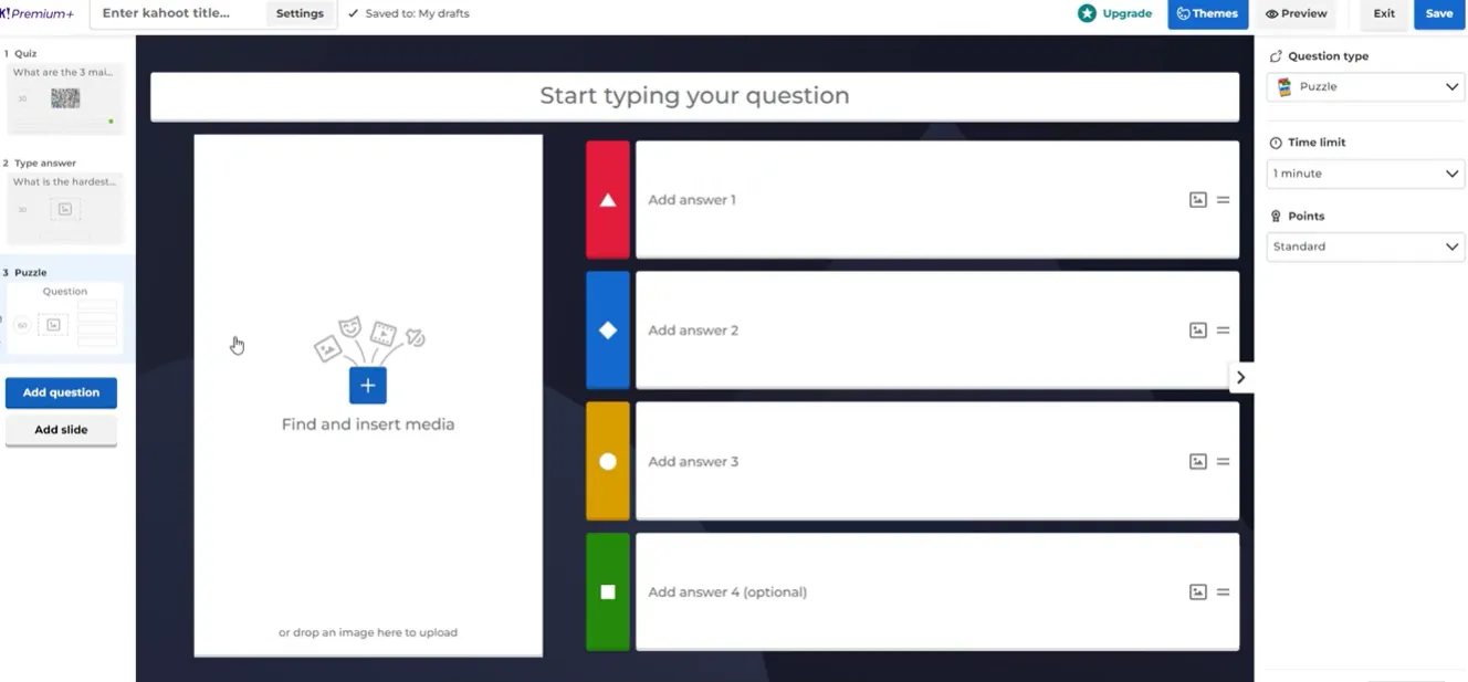 Kahoot’s question variety is genuinely impressive for a game-based platform — and knowing when to use each type is a real skill. A true/false question at the start. A puzzle mid-session to shake things up. A word cloud at the end to close the loop. That intentional mix is what transforms a decent quiz into a memorable learning experience.