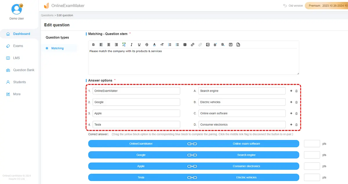 Looking for a brand-new interactive way to engage your readers or students? Well, it is your lucky day! OnlineExamMaker"s matching quiz features can help you with that! Matching quizzes are a popular and fun way to test knowledge and comprehension in a variety of subjects. With OnlineExamMaker, you can easily create your matching quiz in just a few simple steps. So, whether you"re a teacher looking to make the class more exciting or a blogger trying to engage your audience, keep reading to learn how to create a matching quiz that will keep your audience entertained and informed. Let"s get started!