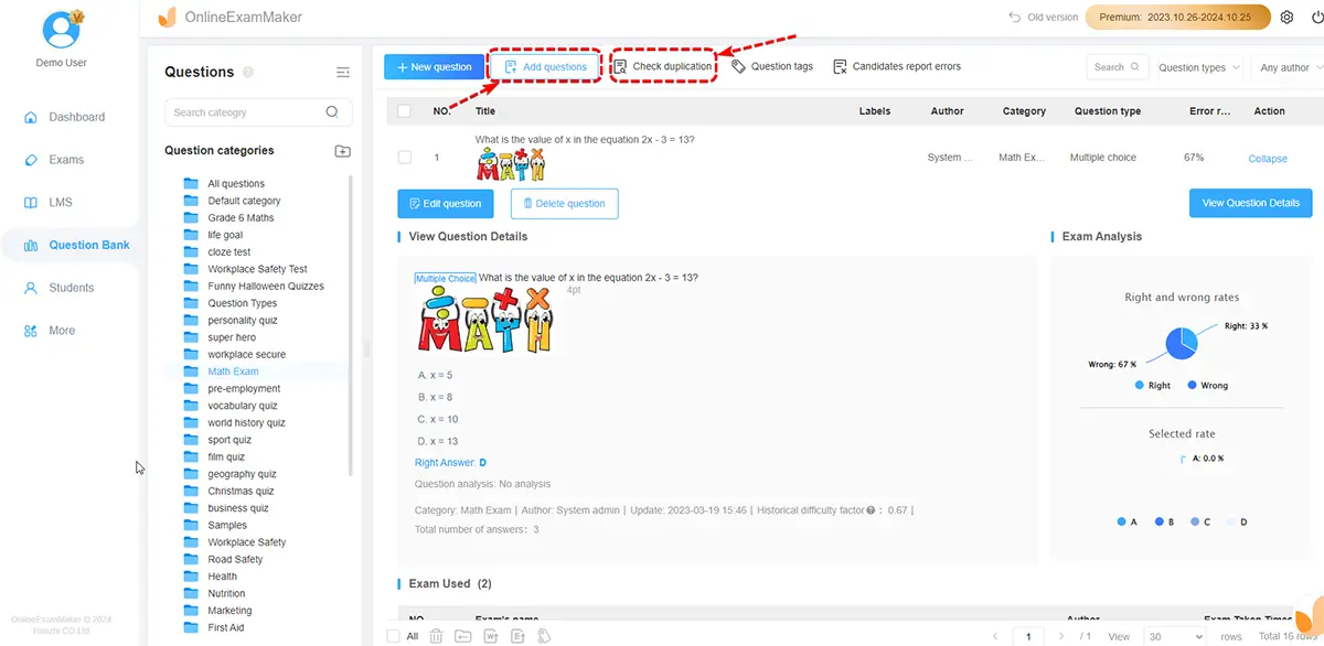 After coming up with some questions, insert it or make them in OnlineExamMaker. To do this, head to "Question Bank" and "question list."