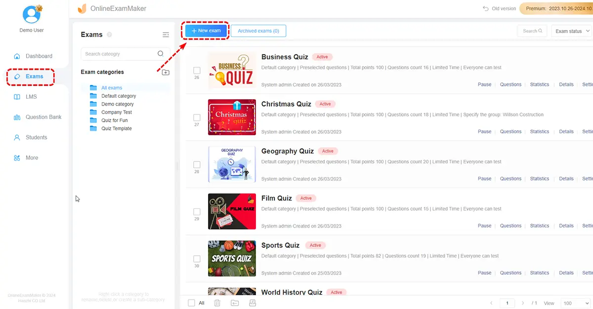 Now it's time to create your exam in OnlineExamMaker. Head on to "Exam" then "Exam list". In this part, click the "New Exam" to start the creation process.