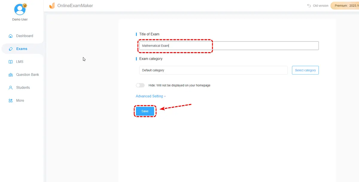 The first part is the title change and the file location. Change the exam title in the empty field, and for the file location, click the "category".