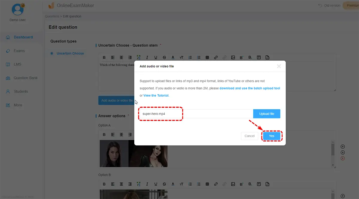 Common tools like OnlineExamMaker, Quizlet, Proprofs, and more that allow embedding or uploading videos right within quizzes. Among these tools, OnlineExamMaker is free to use, without credit card required. You can easily insert interactive video or audio into quiz question in the Question Editor.