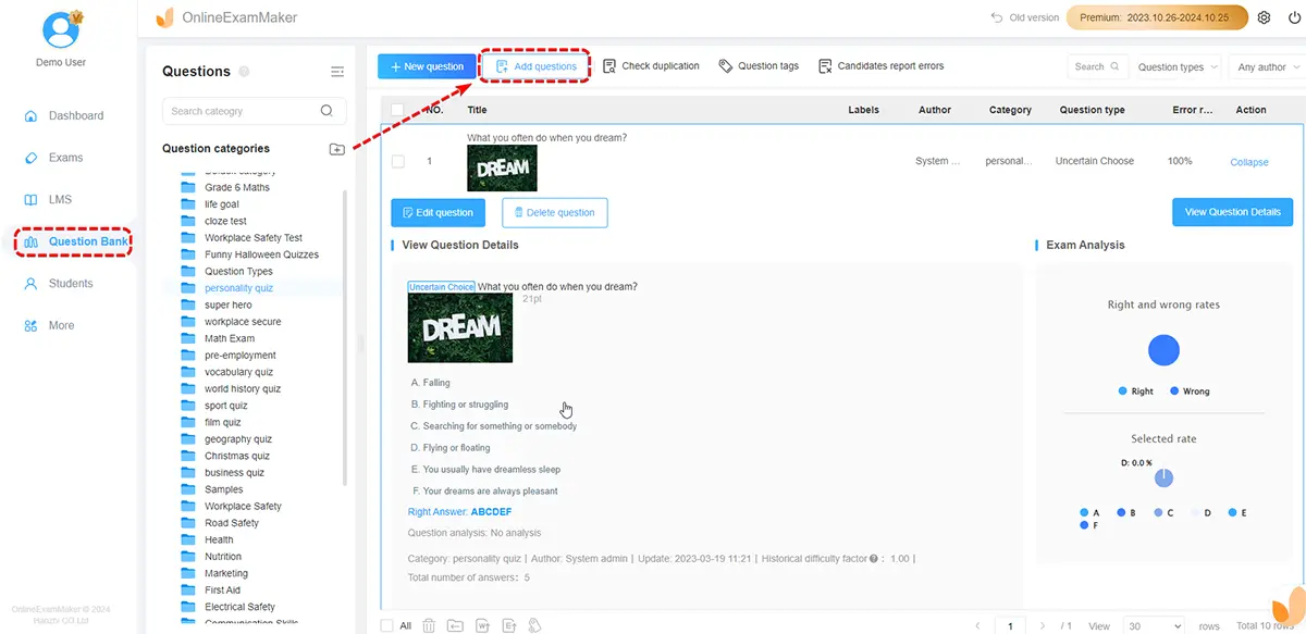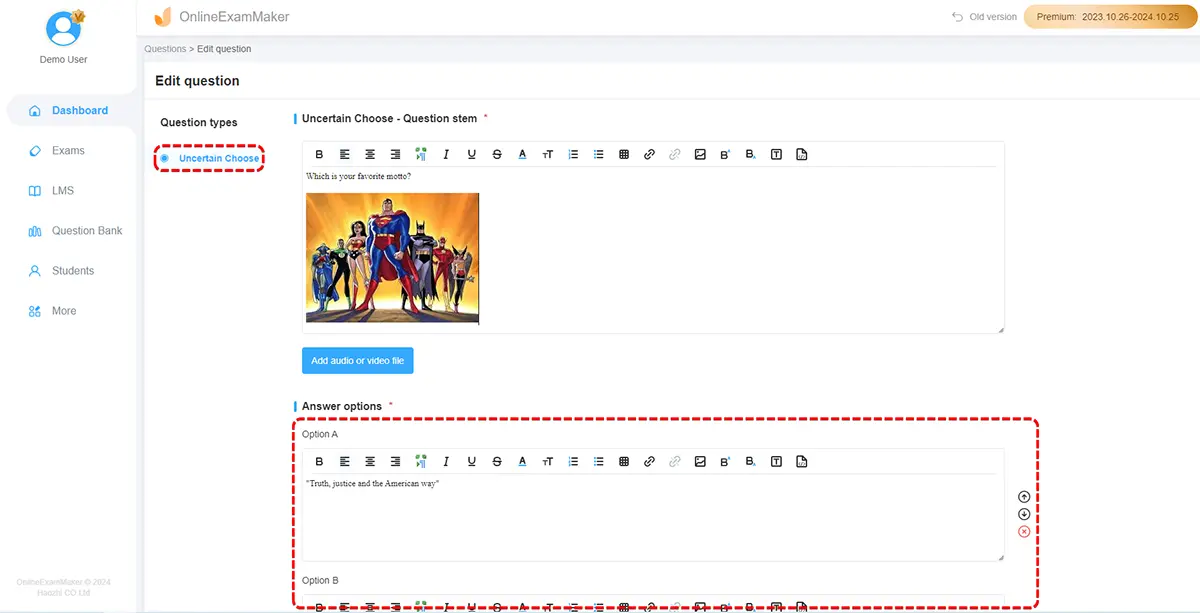 Create assessment items or questions that align with the performance criteria. Ensure that the items are clear, specific, and relevant. Use a variety of question formats such as multiple choice, rating scales, open-ended questions, or video-based scenarios. You can prepare the team assessment questions and upload to OnlneExamMaker question bank.