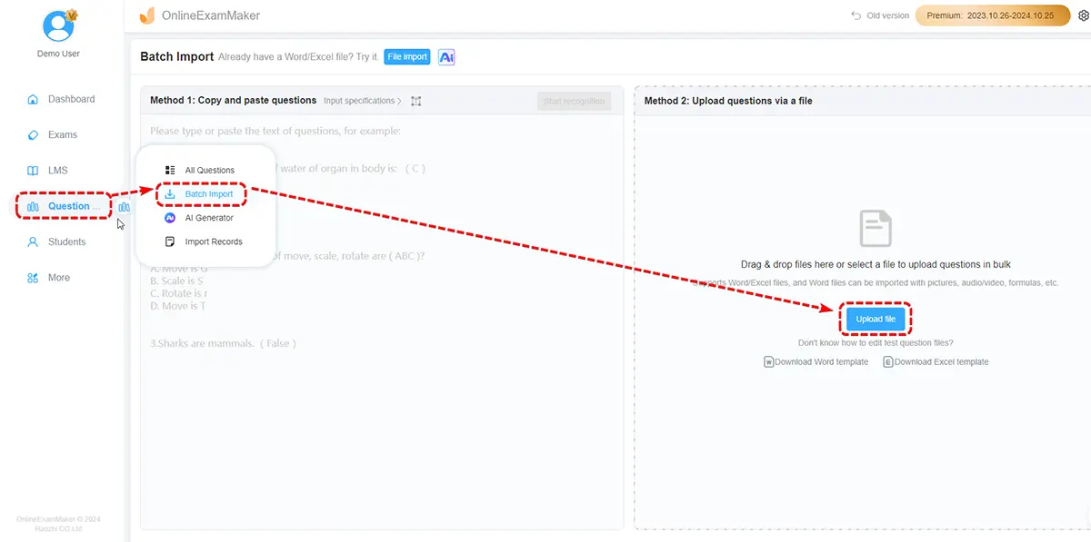 Prepare assessment questions according to your evaluation goal, OnlineExamMaker supports user to upload questions to the question bank in bulk.