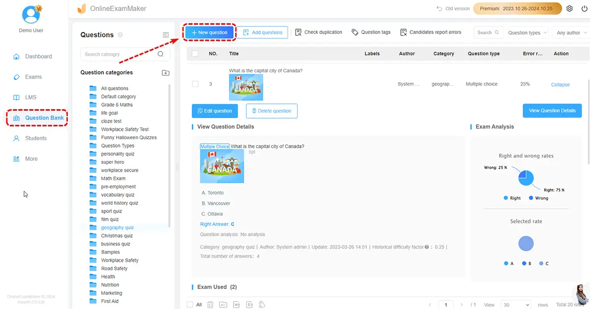 Head to the question bank and the question list at the sidebar. Click "New Exam" button, then fulfill the quiz information to continue.