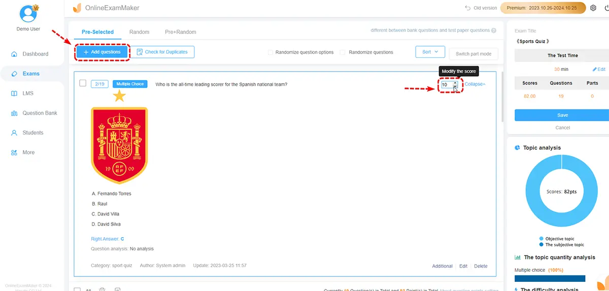 The next step is to add your questions. You can access the question bank or make a new set of questions! Click '+ Add Question'. It opens up a new window. Type in what you want to ask under the 'Question Stem'. Fill in the possible answers under 'Answer Options'. After that, set the correct answer and corresponding points. Click 'Save' to add your question.